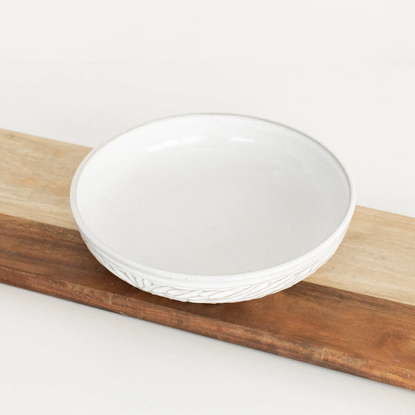 Designed for texture seekers, our carved stoneware bowl is the perfect addition to your dinnerware collection. This versatile bowl features a soft, tactile exterior covered in a glossy white glaze, while the smooth interior is ideal for serving pasta, salads, or your favorite dishes. Handcrafted from high-quality stoneware clay, each bowl is wheel-thrown, expertly altered, and hand-carved with an elegant floral pattern, ensuring that every piece is a unique work of art.